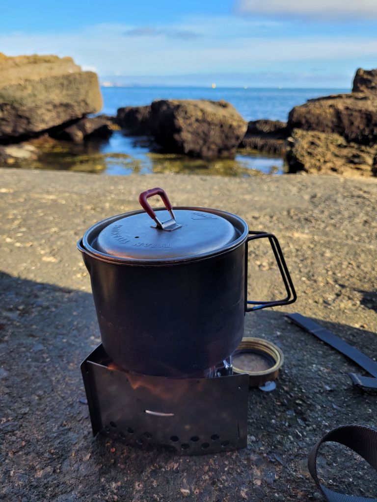 The image shows a small table upon which is a Trangia stove, a cup of tea (& other tea-making accoutrements) & selection of dark chocolate Hob-nobs. It also shows a pair of rather handsome legs.An image showing a blazing Bushbuddy stove with an MSR titanium kettle perched on top.