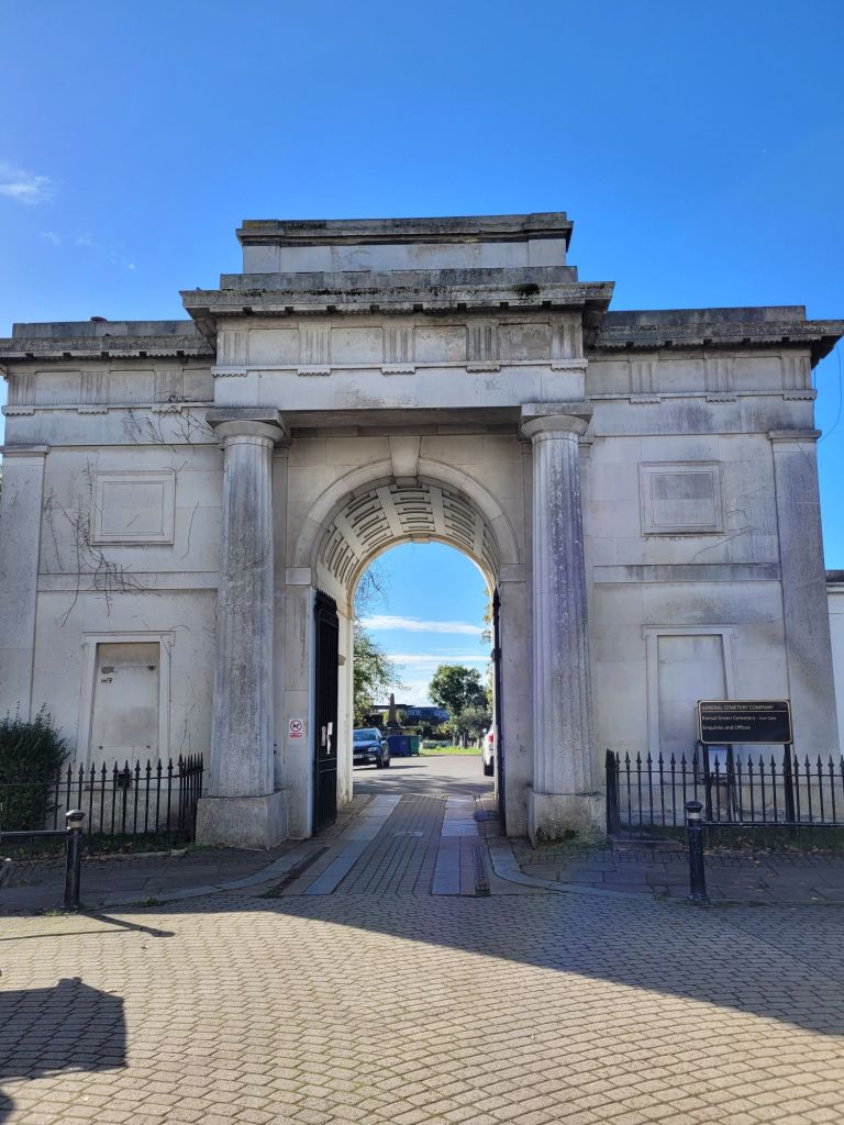 An image showing the grand entrance to Kensal Green Cemetery (note the fluted pillars).