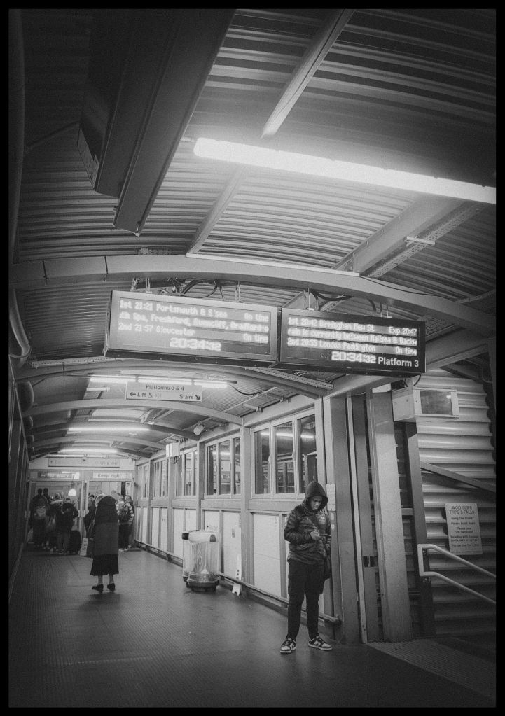 An image showing Bristol Parkway platform, in the rain I might add, at the moment a high-speed train almost blocks my view.An image showing a gentleman observing his mobile device whilst stood underneath an illuminated platform departure sign, inside the covered bridge at Bristol Parkway.